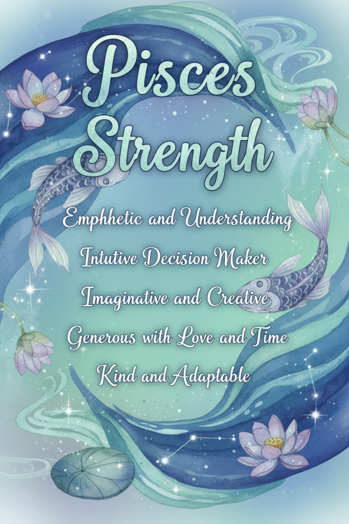 Piscesโ strength lies in their deep empathy and natural understanding of others. They have an intuitive ability to sense emotions that are often left unspoken, allowing them to offer comfort, compassion, and genuine support. Rather than judging, Pisces listens with an open heart and seeks to see situations from multiple perspectives. Their sensitivity is not a weakness but a quiet power that helps people feel safe, valued, and truly heard. This empathetic nature enables Pisces to build meaningful connections and bring healing energy wherever they go.