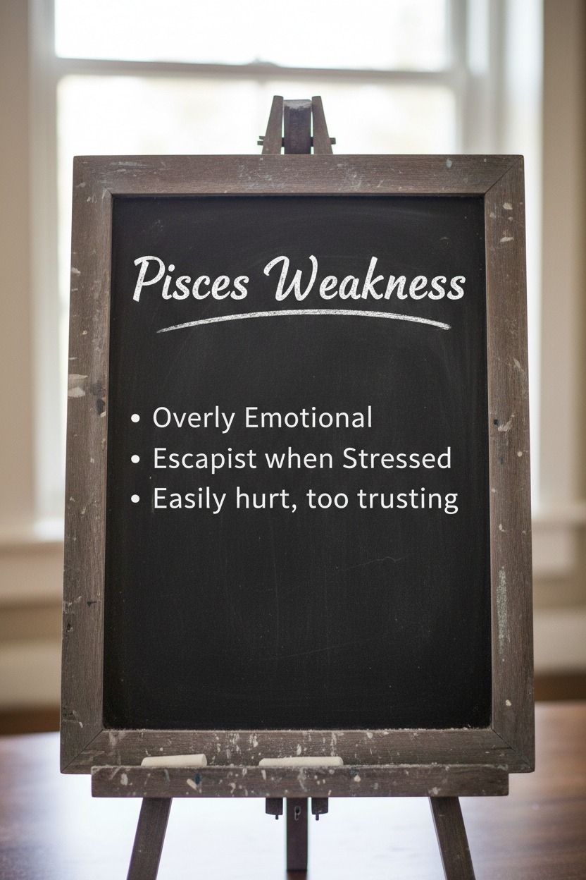 A common Piscean weakness is being overly emotional at times. Because they experience feelings so deeply, even small situations can affect them in a powerful way. Their sensitive nature makes them highly empathetic, but it can also leave them vulnerable to mood swings, hurt feelings, or emotional exhaustion. Pisces may struggle to separate their own emotions from those of others, which can make challenges feel more intense than they truly are. Learning to manage their emotional depth and set healthy boundaries helps them turn this sensitivity into a balanced and empowering strength.